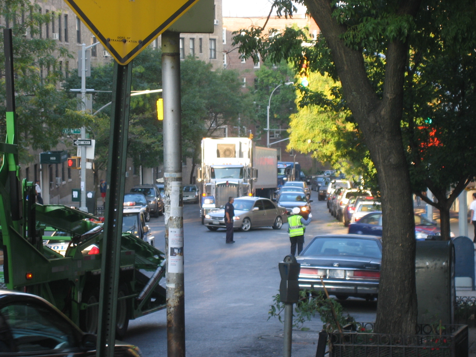 If you were wondering why 181st Street was clogged with truck traffic on Wednesday morning, here is the story in a nutshell. According to police officers at the scene, an early morning oil spill on the upper level of the George Washington Bridge required trucks to be diverted onto local streets in and around Hudson Heights. While automobiles were able to use the lower level to head to New Jersey, trucks are barred from that level. The result was a mess of trucks on 181st Street trying to get to Broadway and other arteries. Compounding the mess was the truck that ran out of gas in the middle of 181st Street and the truck and automobile collision just behind that.